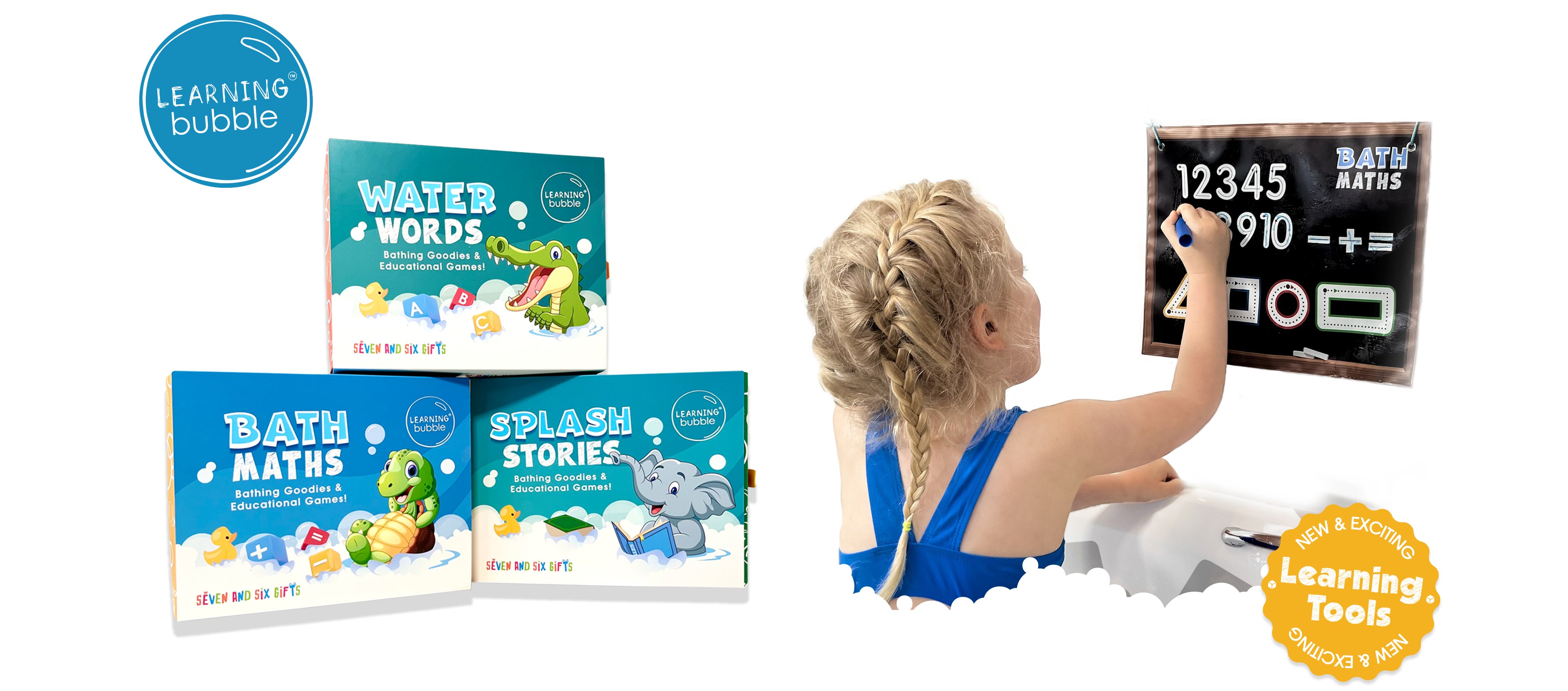 Our Educational Bath Toys make every splash a learning adventure. With our unique Toddler and Preschool bath-time Activities, children can explore numbers, simple sums, words and phonics, even practice creative storytelling while they splash and play.